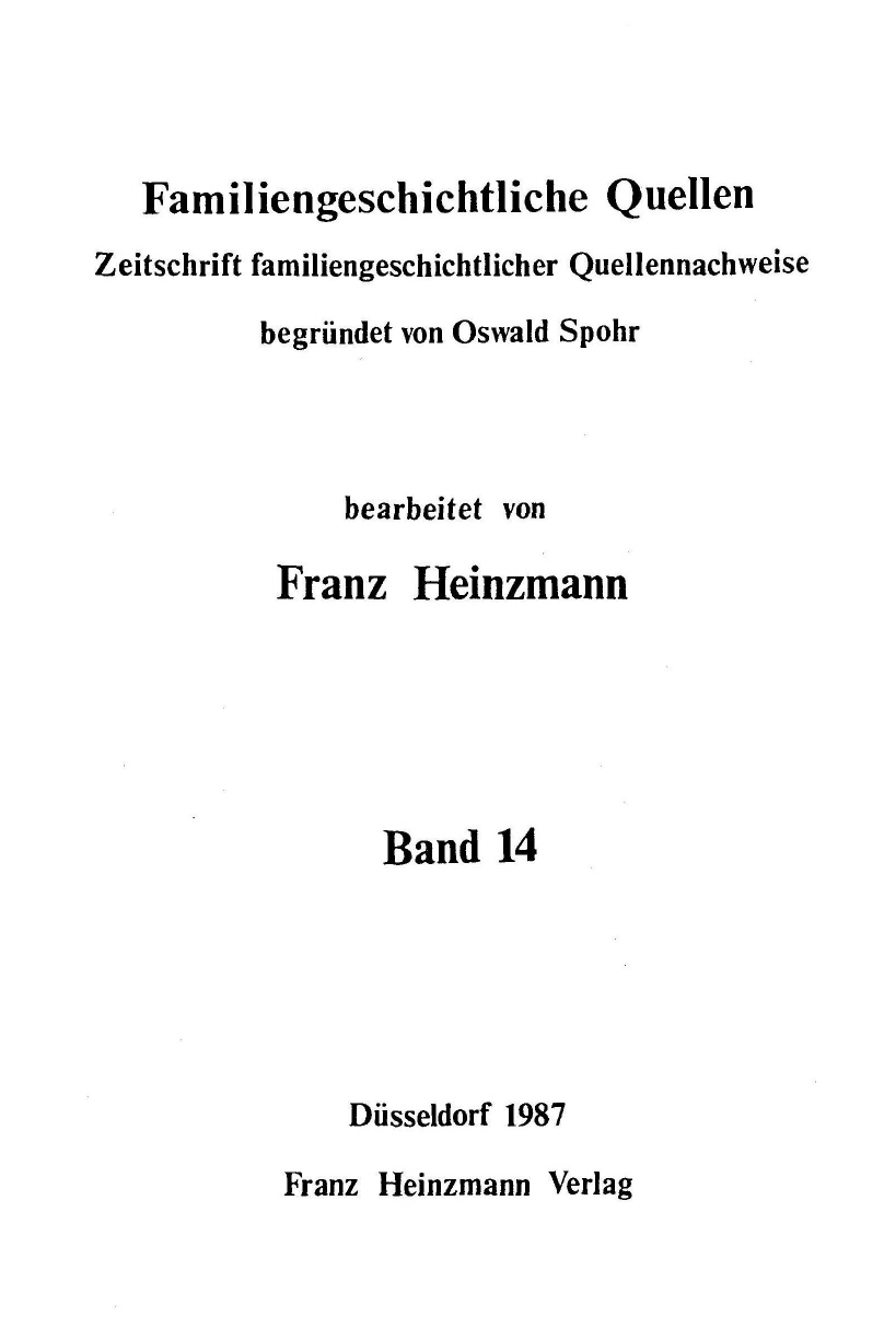HERAUSGEBER: Heinzmann, Franz TITEL: Familiengeschichtliche Quellen. Zeitschrift familiengeschichtlicher Quellennachweise begründet von Oswald Spohr, Band XIV. Düsseldorf: Franz Heinzmann Verlag; 1984-1987, 824 S., Festeinband, Ganzleinen. ZUSTAND: neuwertig Bestellnummer: OS-14