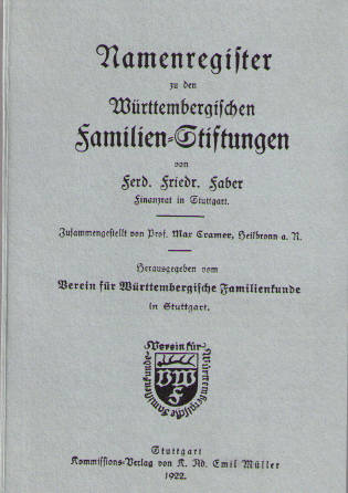 AUTOR: Faber, Ferdinand Friedrich TITEL: Namenregister zu den Württembergischen Familien-Stiftungen. 1922. Nachdruck. Franz Heinzmann Verlag. Düsseldorf 1985. 75 S. Broschur. ZUSTAND: gut erhalten